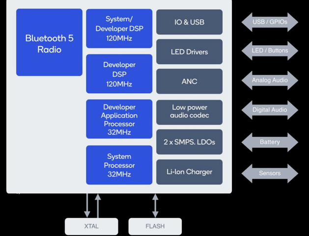 Qualcomm QCC5124システムオンチップ(SoC)は、より長いオーディオ再生のための低消費電力で、堅牢で高品質のワイヤレスBluetoothリスニング体験を実現する小型デバイスのニーズを満たすように設計されています。 QCC5124アーキテクチャは、低消費電力で高性能を実現するように設計されています。 以前のテクノロジーと比較して、消費電力を最大65%削減できるため、ほとんどすべての動作モードでより長いオーディオ再生が可能になります。